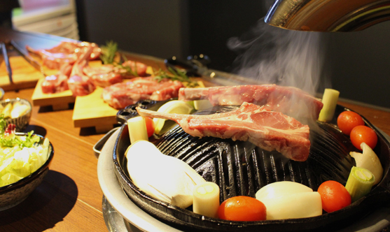 고기 익을 때 기름 튀는 소리와 틀어 놓은 음악에 귀가 즐겁습니다.